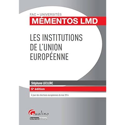 Titre: Mémentos LMD - Les institutions de l'Union européenne Theme1: Droit - Droit européen - Droit institutionnel Theme2: Résumé: La construction de l'Union européenne, peu ou mal connue, est une extraordinaire aventure débutée au milieu du siècle dernier. Même si les difficultés demeurent, elle se poursuit aujourd'hui dans deux directions convergentes : élargissement et approfondissement. Cet ouvrage présente, en seize chapitres, une synthèse claire, rigoureuse, accessible et actualisée de la construction européenne, de ses institutions et de leur fonctionnement. - Étudiants en Licence et Master Droit - Étudiants des Instituts d'Études Politiques - Étudiants des autres filières : Histoire, AES, IUP, IUT, IAE, IPAG, Écoles de commerce... - Candidats aux concours de la fonction publique nationale, territoriale et européenne - Candidats aux concours d'entrée à l'ENM et au CRFPA - Juristes, avocats, juges, diplomates, fonctionnaires nationaux, territoriaux et européens Stéphane Leclerc est Maître de conférences en droit public à l'Université de Caen Basse-Normandie. Chaire européenne Jean Monnet.Broché=256 pages. Editeur Édition =Gualino; 5e édition (19 août 2014). Collection =Mémentos LMD. Langue =Français. ISBN-10=2297039603. ISBN-13=978-2297039604. Dimensions du produit=17 x 0,8 x 24 cm. Moyenne des commentaires client =Soyez la première personne à écrire un commentaire sur cet article. Classement des meilleures ventes d'AmazonDroit international - Droit européenGestion et AdministrationDroit - Sciences juridiques=441.345 en Livres (Voir les 100 premiers en Livres) .zg_hrsr { margin: 0; padding: 0; list-style-type: none; } .zg_hrsr_item { margin: 0 0 0 10px; } .zg_hrsr_rank { display: inline-block; width: 80px; text-align: right; } n°452 dans Livres > Droit > n°5978 dans Livres > Entreprise et Bourse > n°17795 dans Livres > Etudes supérieures > Université >.